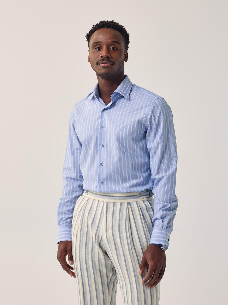 This brown and white candy stripe shirt makes its statement up close, while reading refined and understated from a distance. With brown acting as a natural neutral, it pairs effortlessly with most colours across both casual and tailored looks.