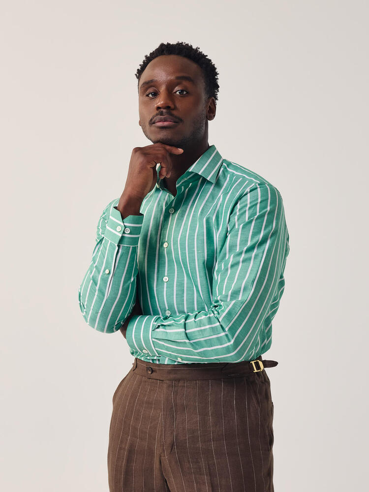 This azure blue linen-cotton pencil stripe dress shirt strikes a confident balance between character and ease. Bold yet unpretentious, it feels just as at home paired with crisp white trousers as it does under a classic linen jacket.
